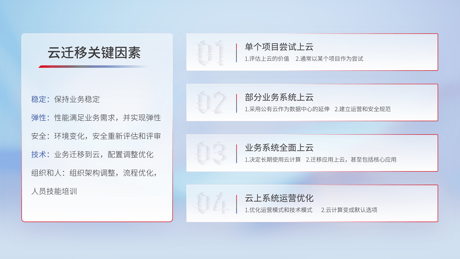 结合实际业务,,从规划设计、、、、云平台选型、、云原生改造、、、数据迁移、、集成交付,,,,迁移全过程为客户识别最佳上云路径,,做好风险识别管理,,设计网络架构、、、身份权限、、、、安全审计合规、、、操作审计、、日志审计、、、监控告警策略、、多站点容灾设计等,,,,对云上基础设施进行整体规划,,,提升IT治理水平,,以满足弹性、、高可用、、、、高性能的需求。。
