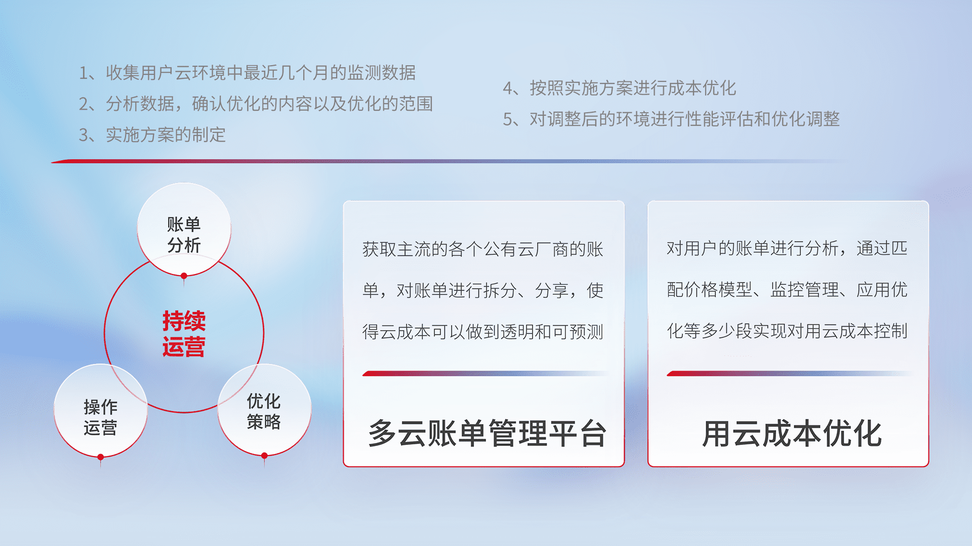 通过多云纳管,,以统一的资源数据模型把客户的云资源进行抽象和封装,,,进而实现对多云资源的统一操作,,,,保障云资源管理的可靠性、、、稳定性与可用性。。。量身定制化运维内容,,配置、、、开发运维、、、、补丁管理、、备份、、、监控、、、认证和访问管理、、、、审计和日常巡检等,,,,保障在用云过程中的可靠度,,稳定度以及高可用率。。